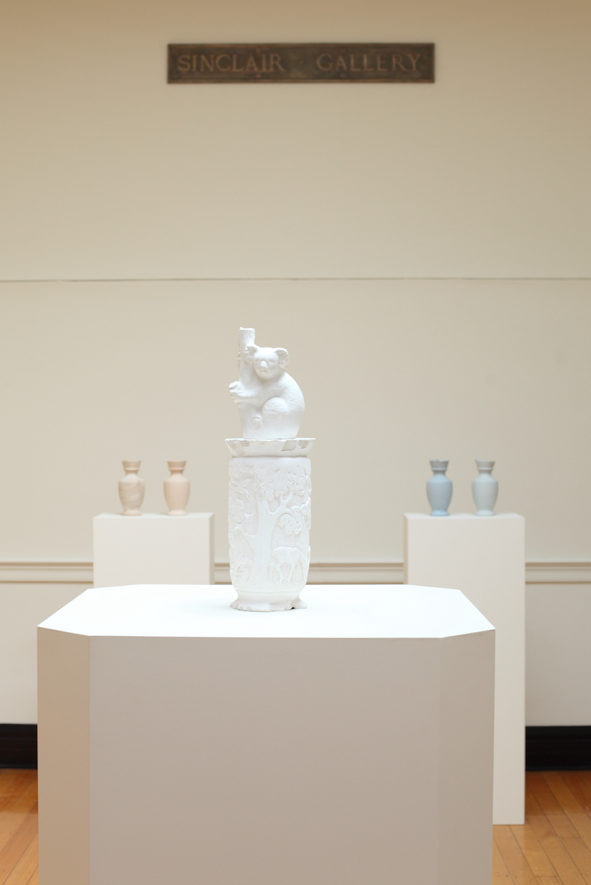 Imbued with a profound love and understanding of the rich history of ceramics, Damon Moon’s work bridges a range of concerns around high and low art, decoration and function, personal and shared histories, values and ideals. These concerns lie at the heart of Moon’s major work Epergne 2020 currently on view at the Castlemaine Art Museum. A curious sculptural object comprised of a white bisque fired, slip cast koala, atop a bas relief, cylindrical plaster form decorated with deer and squirrels, Epergne suggests a fusion of Australian and non-Australian sensibilities. The depictions of fauna in Moon’s work are not the result of his careful observations of nature. The two elements that form Epergne have been sourced from the wealth of archival material at the Bendigo Pottery where Moon works as Creative Director of the Centre for Learning and Design.