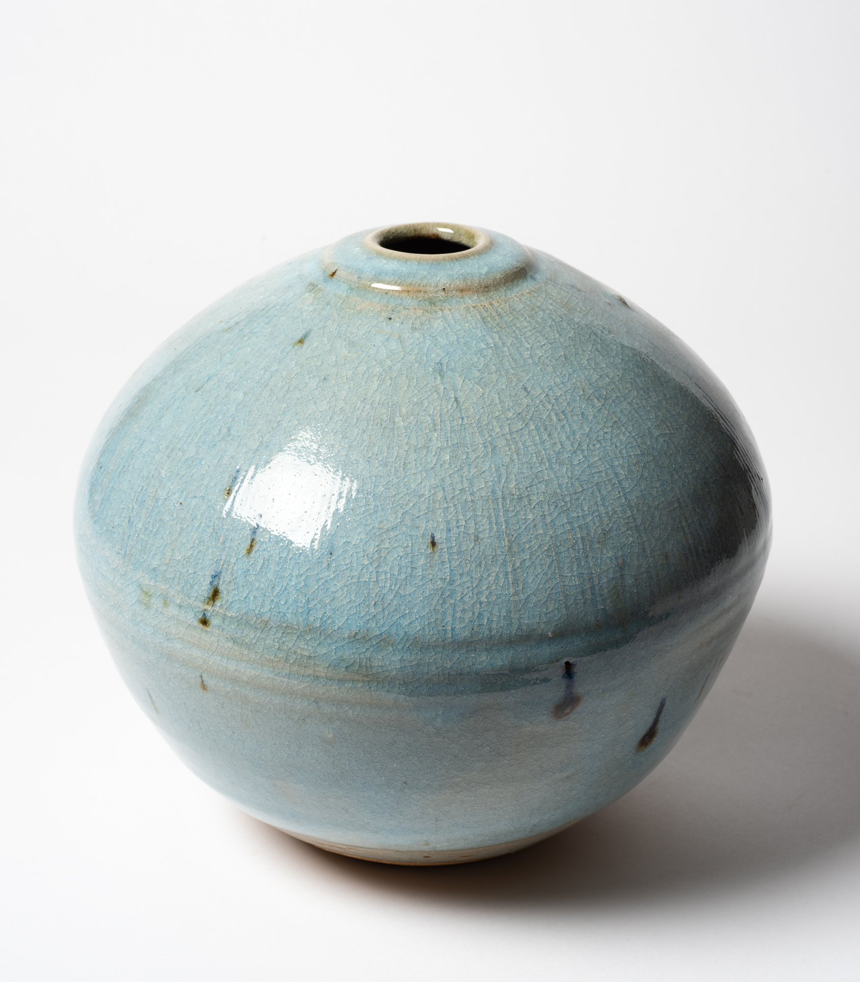 The three works by Peter Rushford currently on display are glazed in a blue opalescent glaze known as Chun/Jun which was first developed during the Northern Song Dynasty (960-1127). Chun is within the green ware glaze continuum and the opaque blue is essentially an optical effect created by light refracting off the inside of bubbles trapped in the glaze.
