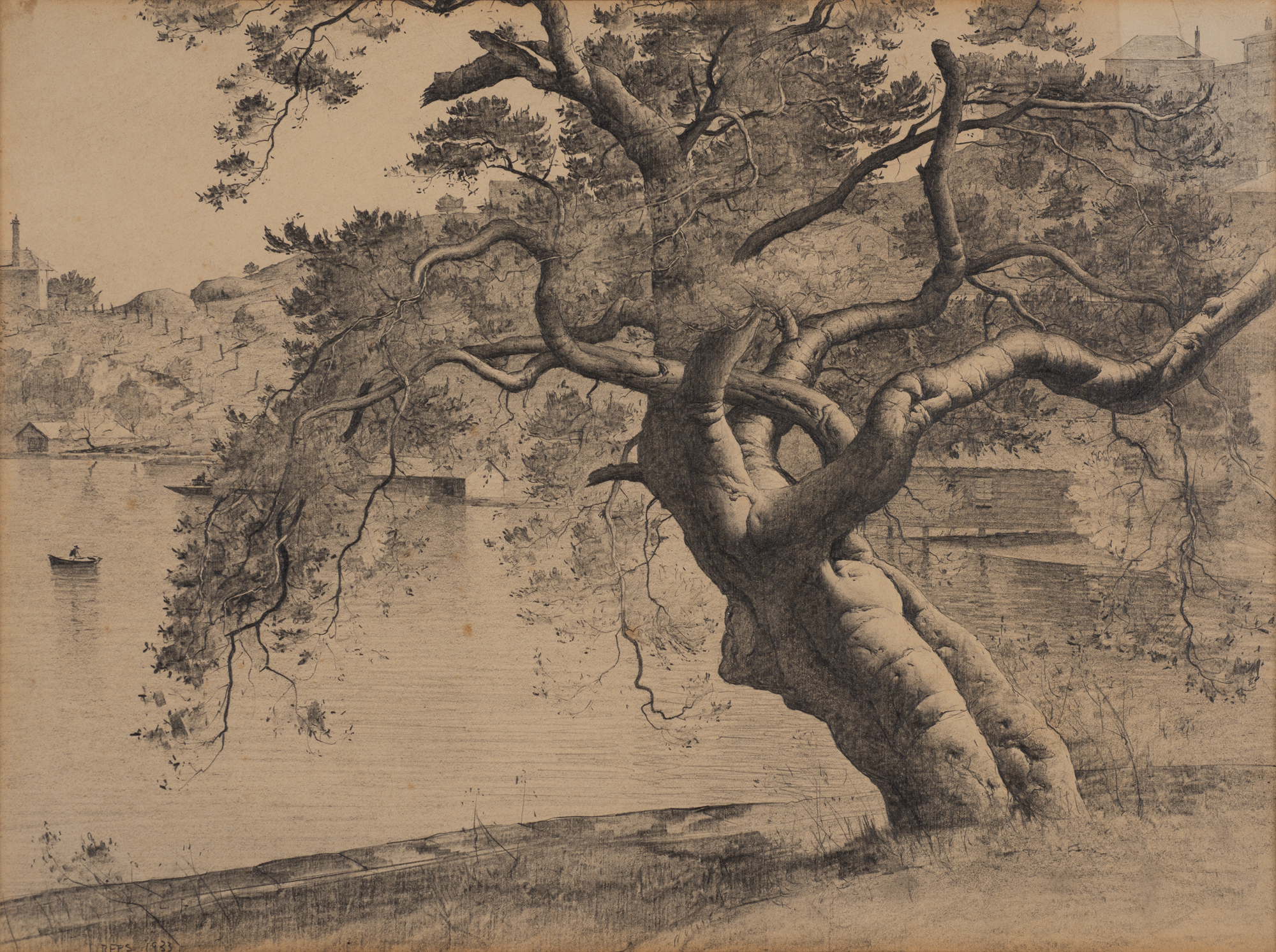 Lloyd Rees’s drawings are masterful. He has the capacity to distil the spirit held in nature, in this case, in a Moreton Bay fig tree; a gnarled, broad sinuous trunk; a tree which commands you look at it. I take in its trunk—the contorted, thick-set trunk which from some angles reflects a muscular human form—then look along the arching branches, to the filigree smaller stems, to the miscellany of leaves. And then to look up into the wide and protective canopy, and consider how long this remarkable tree has lived, its roots still deep in the soil. I wonder at how this fig has been here for many decades, enduring hot Australian summers, cold winters, wet seasons, and drought. This is Lloyd Rees’s achievement, using a pencil and paper.