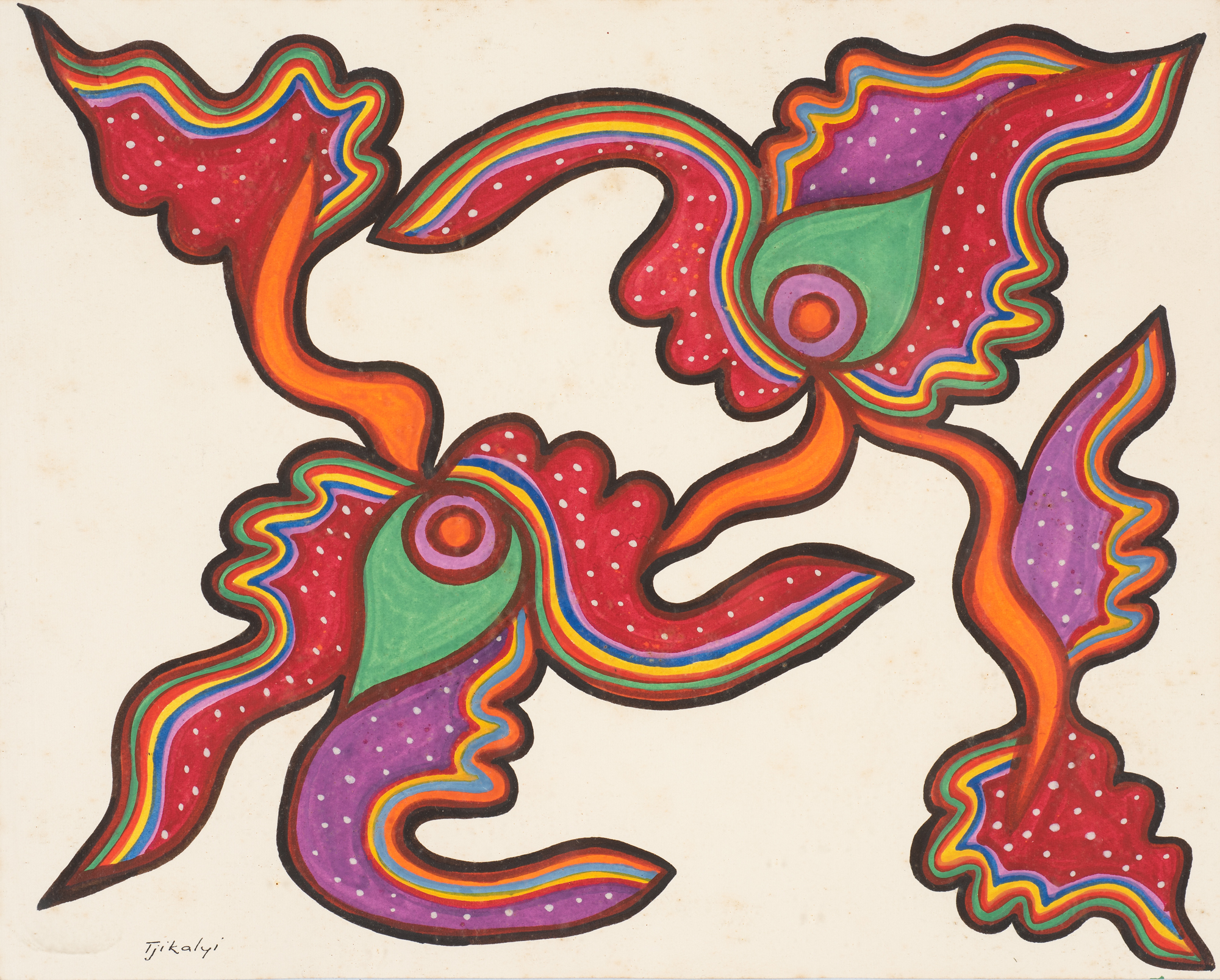 As with all art, the walka paintings reflect their time and place. They speak to us of the long gone world of Pitjantjatjara girls and women at Ernabella Mission when they created these designs in the craft room as decorative motifs for an evolving art and craft industry. Traditional art involved the use of naturally occurring materials such as sand, sticks, ochre and charcoal. We can see the imaginative freedom that came to the artists with the arrival of water-based paints and brushes. They could paint their walka motifs using bright colours, bold shapes and flowing brush strokes on white paper. We also see the influence of the mission teachers and advisors in Tjikalyi’s signature — her given name, written in Western style.
