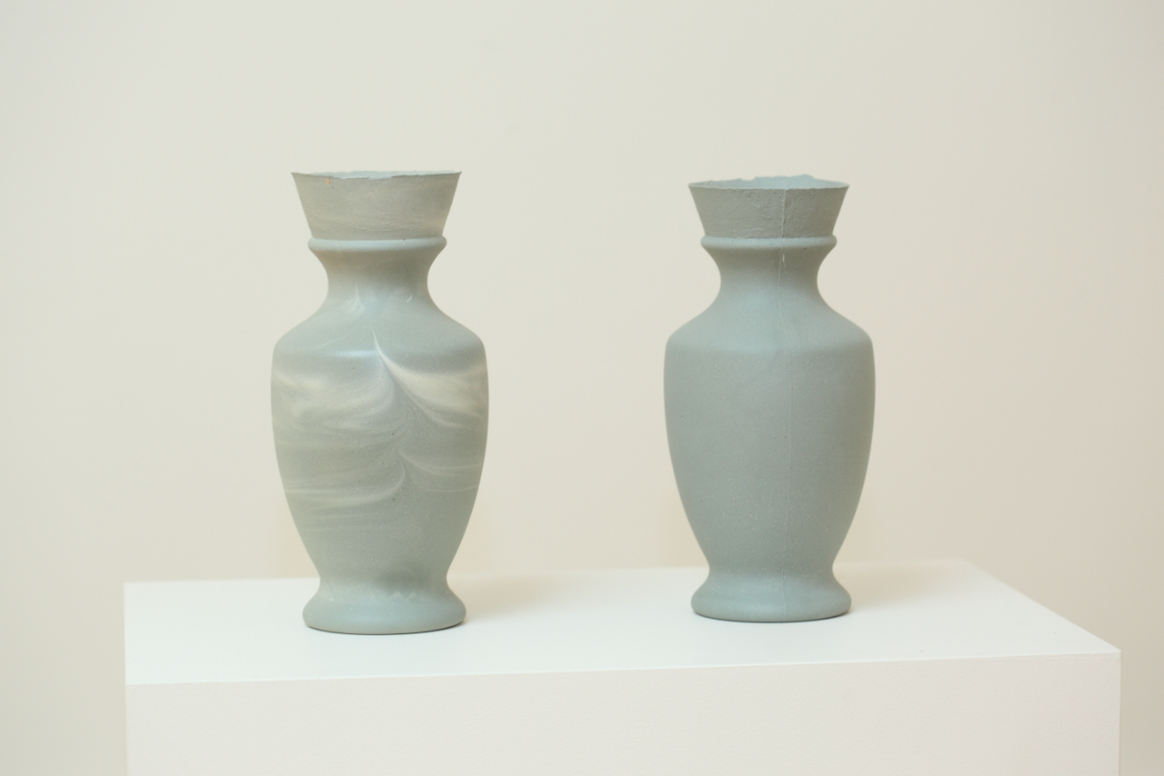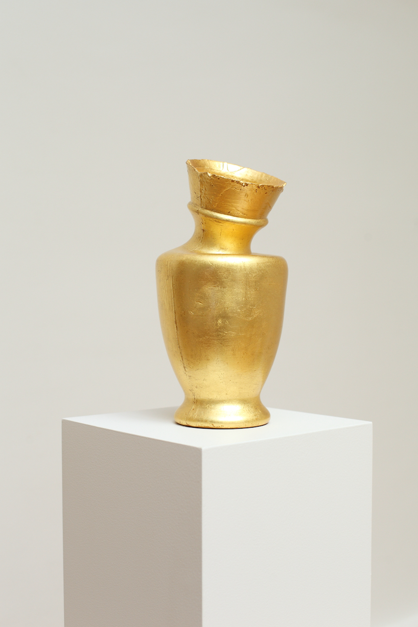 A series of higher than usual plinths stand against the west wall like funereal Egyptian sentinels, holding pairs of vases aloft. Their subtle variation in tone and negative space draws the viewer into the gallery. A golden vase high to the left dips its head, while a magnificent centerpiece sits on an octagonal plinth that echoes the gallery shape. Here, Moon has stacked two stark white sculptures cast from kitsch Bendigo moulds, possibly of similar vintage to the Sinclair. This luminous work, entitled Epergne (an ornamental centerpiece for a dining table) contrasts with the more simple forms exhibited. Embedded in this work is a quintessentially Australian conflict, between the Australiana of the upper form and the bucolic European scene below.
