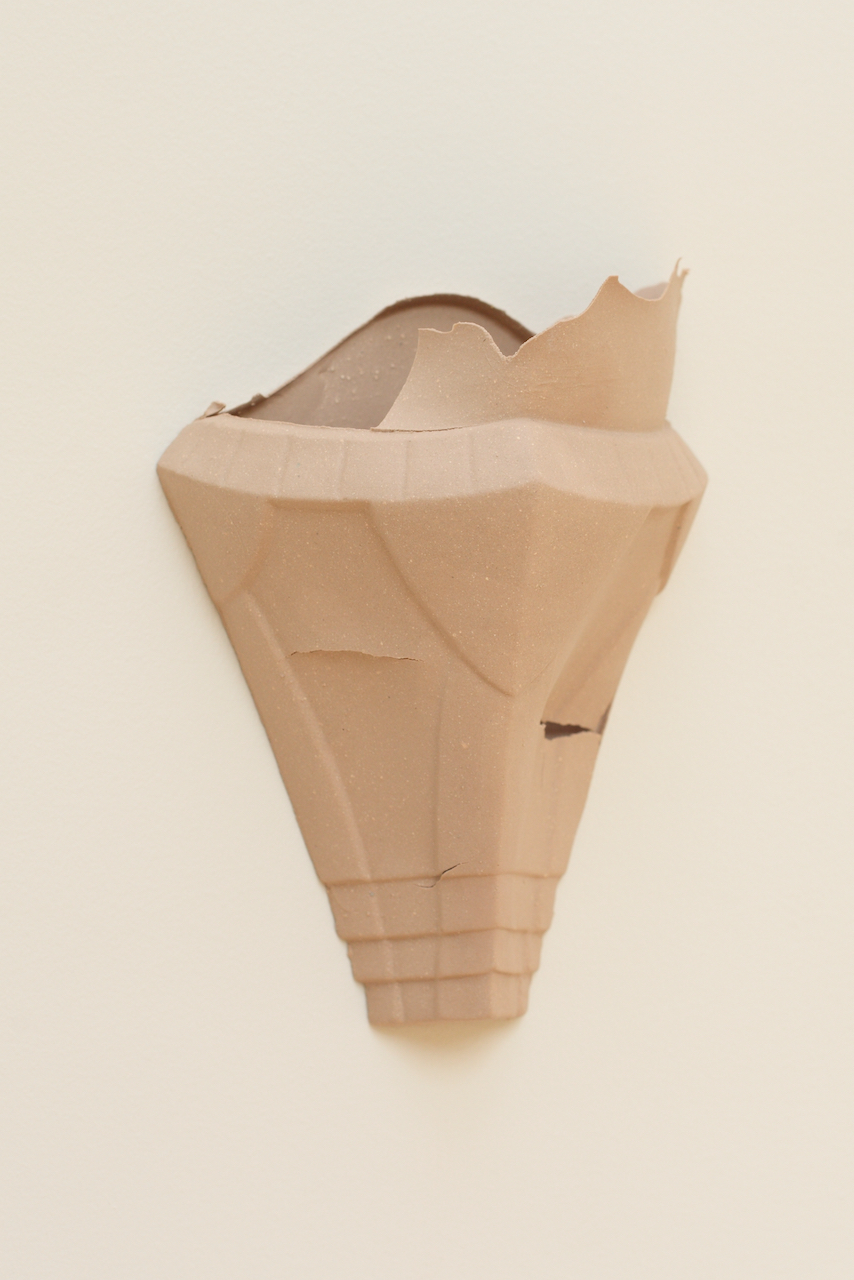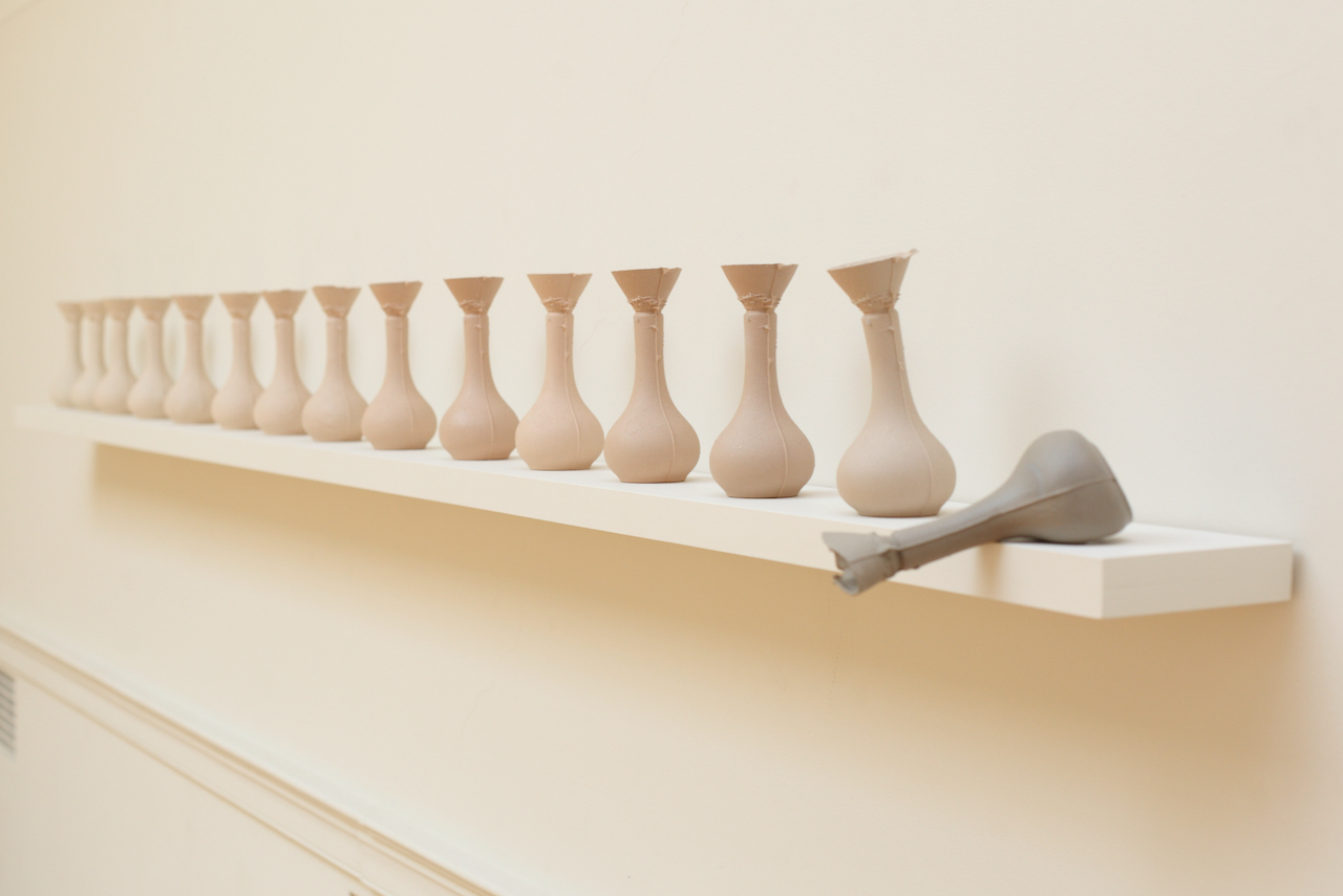 Moon has created an installation of breathtaking beauty and lightness of touch. The exhibition is a meditation on repetition, which emphasises the ethereal qualities of the Sinclair. Along the north wall sits a long slender shelf at eye height, with a series of simple vases cast from a traditional Bendigo Pottery mould and which miraculously vary in tone. Surprisingly, at one end, a vase appears to bend and leap from the shelf. A sconce, reminiscent of an Art Deco mask, looks down upon the viewer.