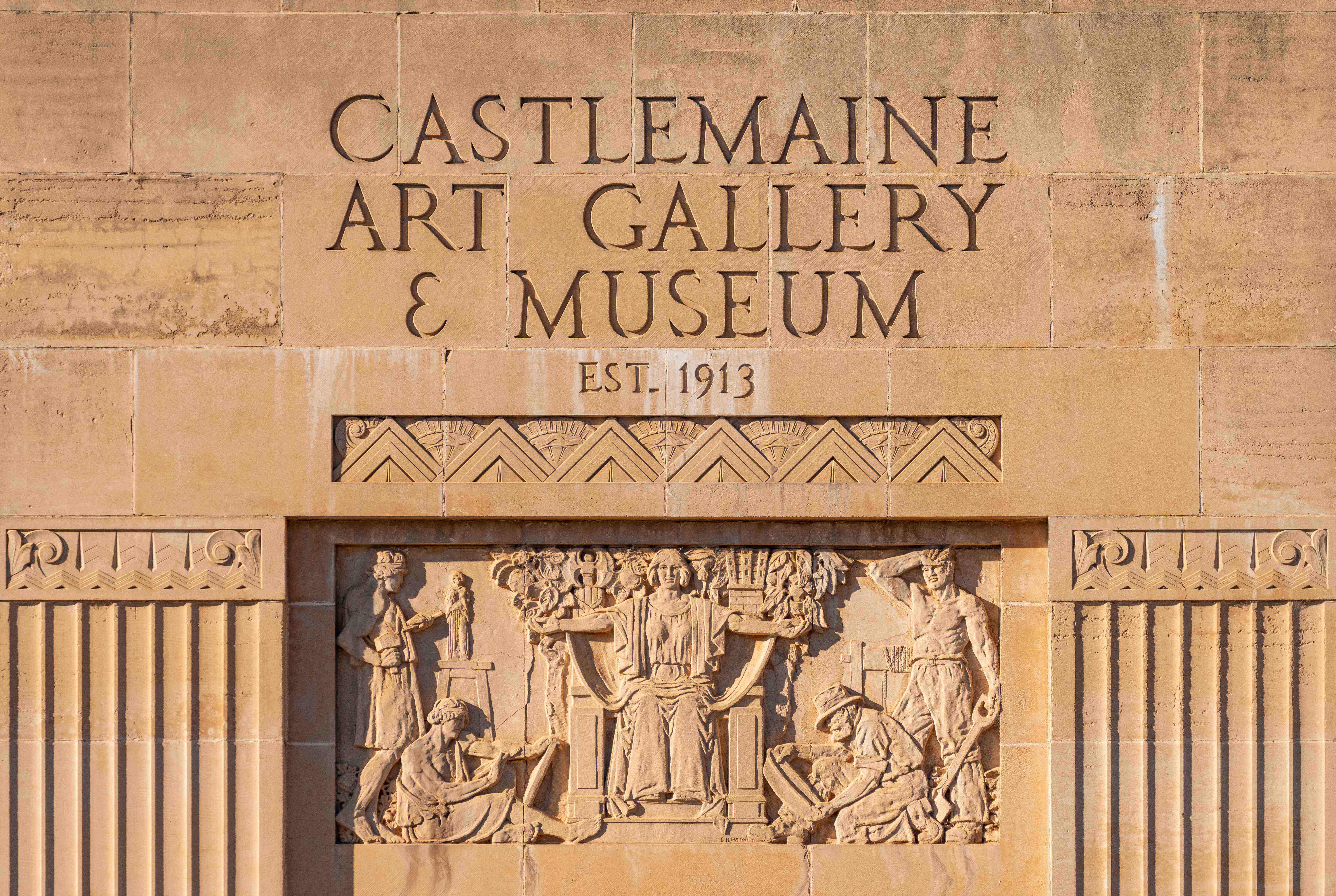 For that, he used high-fired terracotta cast in pieces and assembled for installation. For CAM, since it had to be transported from his Melbourne studio, he cast the bas-relief in artificial stone. The process is evident in the way none of the shallow figures is undercut, so that it could be easily extracted in three pieces from the negative mould, itself cast in plaster from a clay original. That is why no chisel marks are visible, and you can see the incisions into wet clay that form spare line work… it is modelled additively, not sculpted 'subtractively' in the traditional sense.