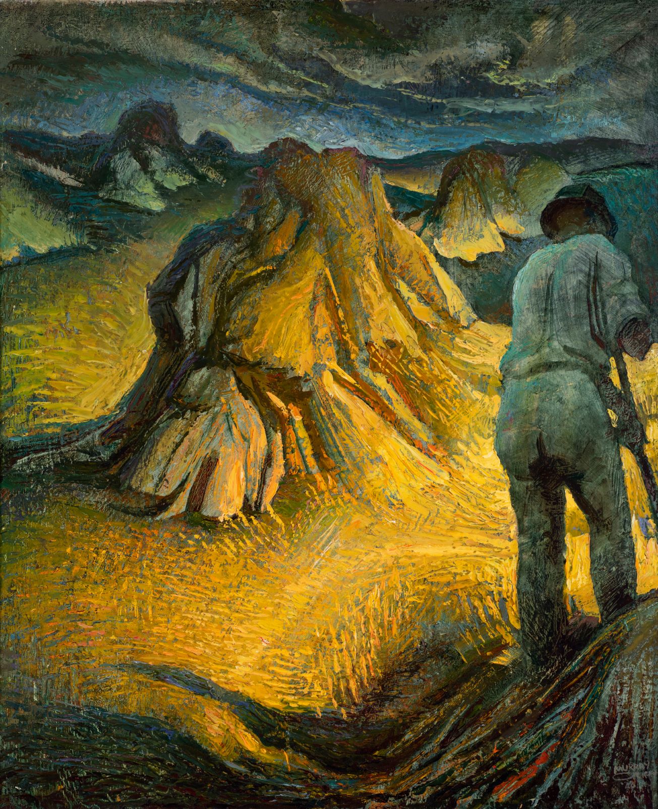 A companion painting from this series The Journey by Griffin, of a shearer, was originally titled, significantly, The Warrior. The human protagonist of Stooks and Storm might be Samael, one of the seven archangels — not ‘The Grim Reaper’ we have come to know — but whose Kali-like destructiveness is for Anthroposophists imagined to be a benign divine assignment in a global zeitgeist. Art historian Alisa Bunbury writes in 1998, that it was such vehement beliefs which Griffin called “a recognition of a deeper world, a spiritual world which I think people at heart believe in, but are a bit frightened of”, that brought the neglect he now unjustly suffers.