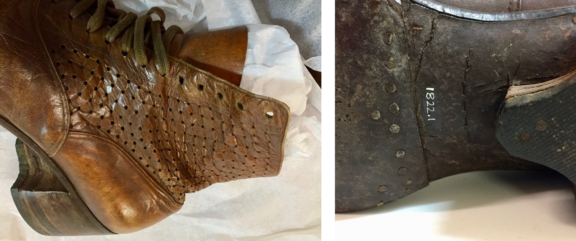 The above lace up boots with buttoning flap at the calf and hard toe cap were purchased from Buckley & Nunn Ltd Melbourne. Identified possibly as ‘Russian calf lace boots 1909’, 1 the boots feature decorative seams, a lighter shade leather lining and an unlined leather tongue. Scuff marks and abrasion areas are evident – the role of conservation is to stabilise materials, prevent further damage and to retain those aspects of an object that provide meaning and value rather than to make the object appear new.
