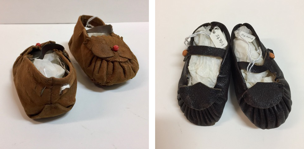 Interestingly, two small pairs of baby shoes in the collection were worn by the Gallery’s first female Director (1969-1975), Beth Sinclair. The moccasin style construction with visible hand stitching in tan suede, black leather and glass beads, were made by her father the water colourist RW Sturgess. These were her first baby shoes and show the impressions of her tiny feet on the soles as well as a hand stitched repair.