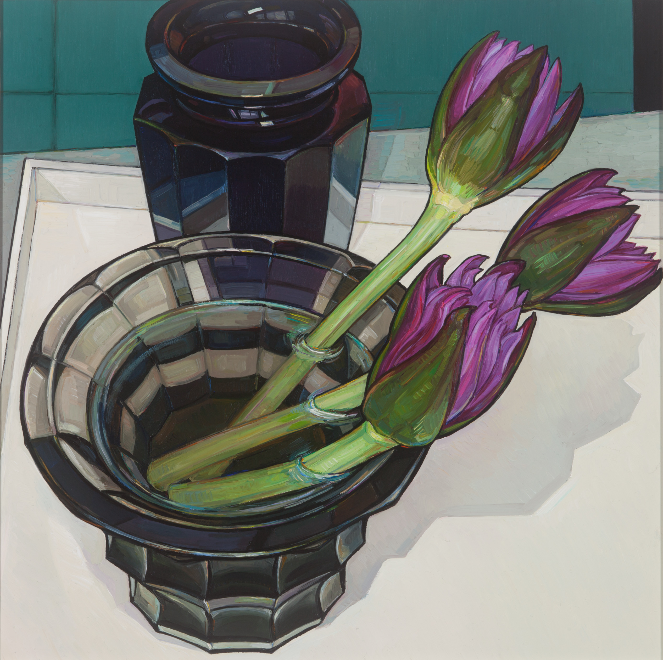 The subject matter of this work by Criss Canning—water, light, reflections and water lilies—may be similar to Monet’s, but the two artists’ visions are radically different. Monet found a way of representing what he called “the moment of landscape” in the exterior world, exploring the fugitive effects of light, a gust of wind or a ripple of water. Canning’s painting, in contrast, is set firmly in an interior world where dark shadows are juxtaposed with light on the solid yet reflective glass forms.