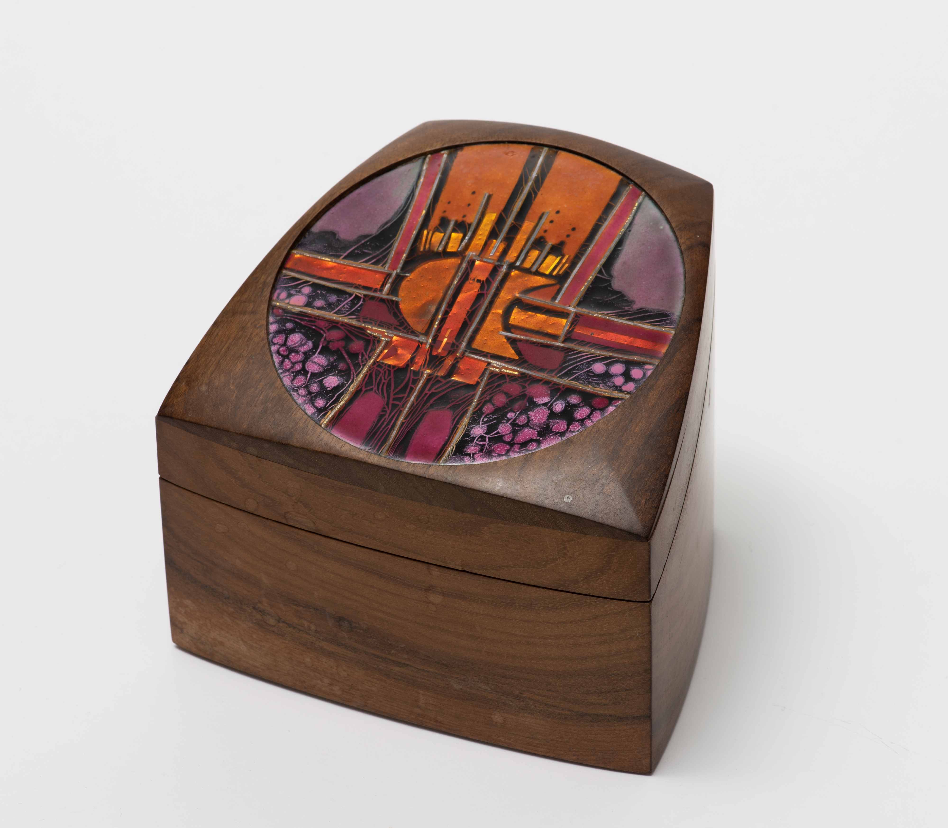 Lancaster’s enamels were distinguished by their high quality of design and execution and the artist’s willingness to experiment, for instance with extremely high temperature firing. She favoured strong, deep colours, her frequent use of blues deriving from her spirituality and the environment. Some of her multi-coloured cloisonné work was reminiscent of stained glass. In her surface designs she favoured simple shapes such as a circle or cross; these too had spiritual and environmental resonances for her. For example, Lancaster told me the abstracted design on the lid of the cigar box in CAM represented a grove of tea trees with a moon above.